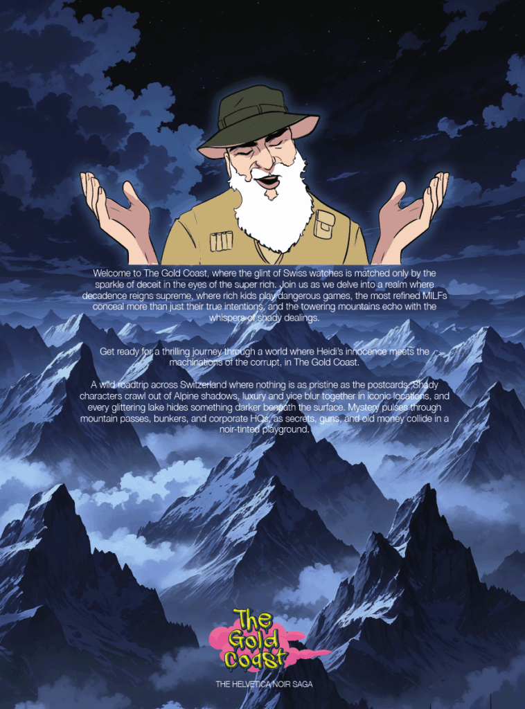 The Gold Coast™ is a bold, uncompromising comic for adults set in a darkly glamorous version of Switzerland—a world where money whispers, power smiles, and nothing is as clean as it looks. Rooted in the Helvetica Noir genre, this is a comic for grownups who crave sharp storytelling, moral ambiguity, and a visual language that feels closer to cinema than traditional panels on a page.